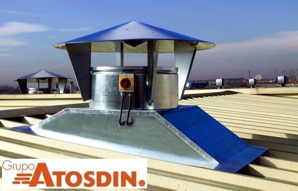 Grupo de ventilación industrial aspiración dinámica instalado en tejado de nave industrial. Fabricado en Acero Galvanizado, con interruptor de seguridad paro-marcha (opcional). Con base de sujeción a cubierta fabricada a medida.