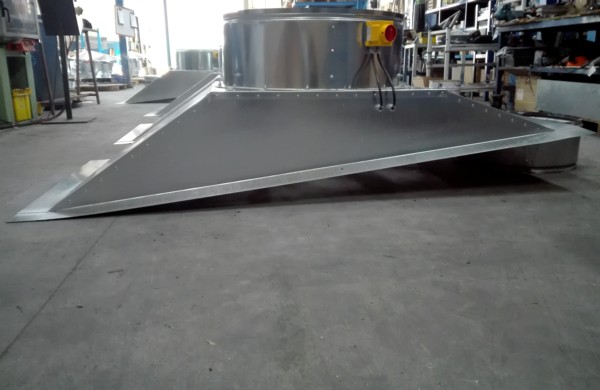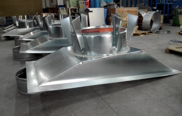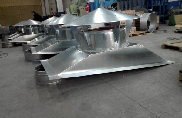 Fabricamos las bases de sujeción a cubierta en chapa galvanizada a la medida del tejado de la nave. Seguidamente fijamos el cuello de diámetro 820 mm. e instalamos el extractor trifásico.