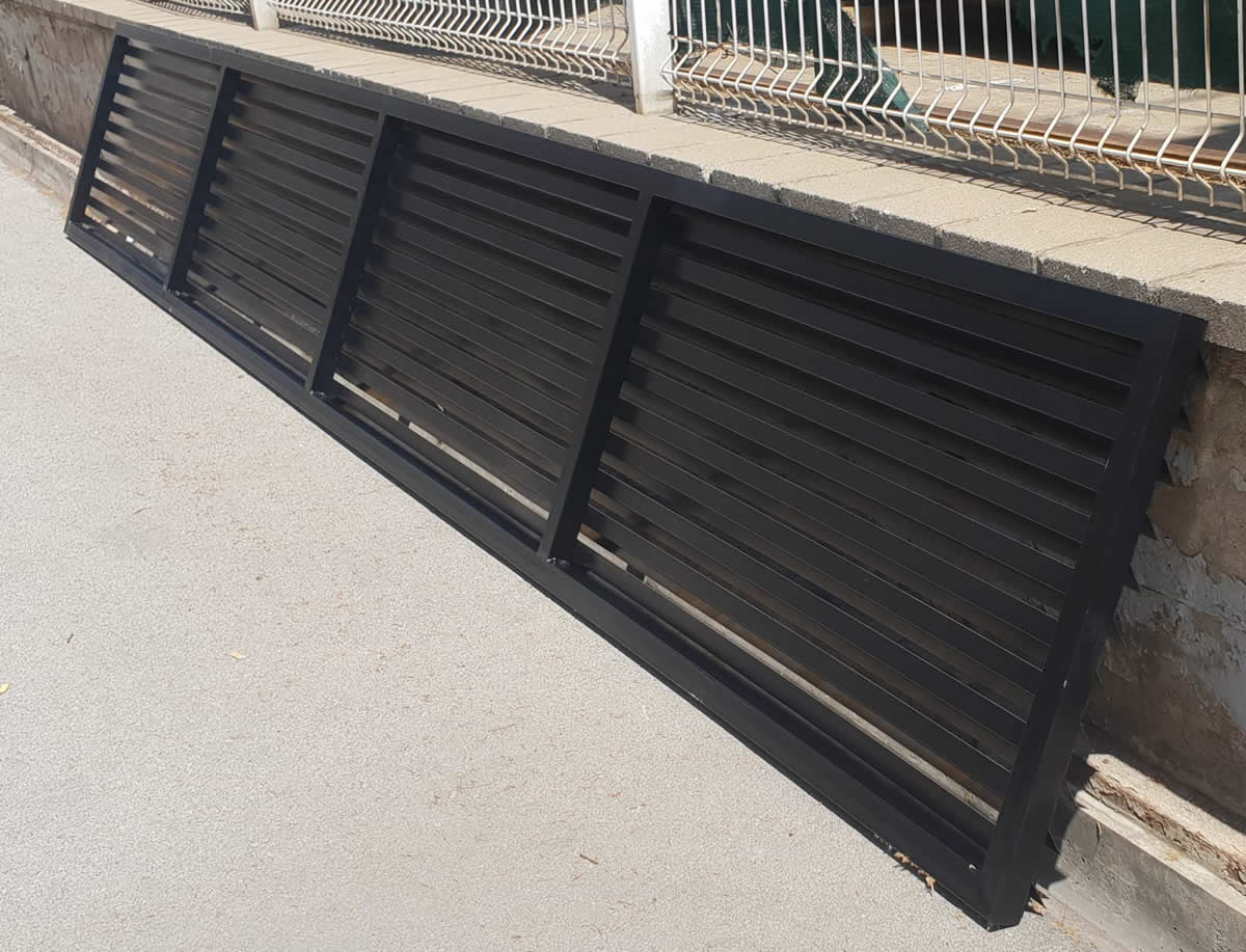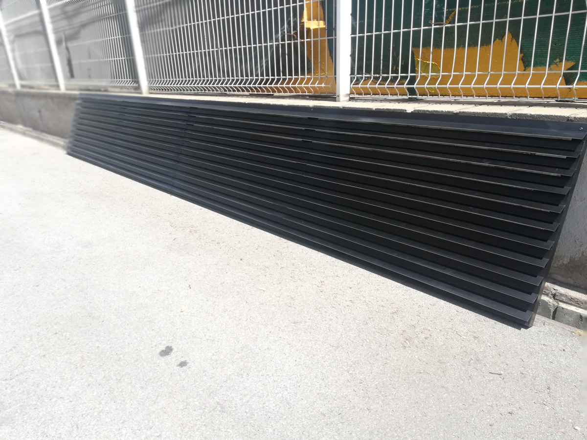 Para ventilar una sala de máquinas de una nave industrial se han suministrado unas rejillas de fachada de ventilación industrial permanente. Con lamas en aluminio y marco de tubo en acero galvanizado. Fabricado a medida para garantizar la entrada de aire y la correcta ventilación del espacio.