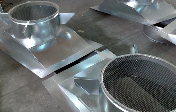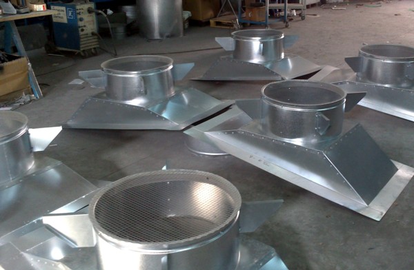 Empezamos la producción de los aparatos estáticos fabricando las bases de sujeción a cubierta fabricadas a medida de la cubierta de la nave industrial. Seguidamente se instalaran los cuellos y en los mismos colocaremos las cuatro escuadras donde irán instalados los sombreretes estáticos.