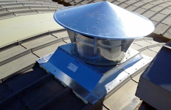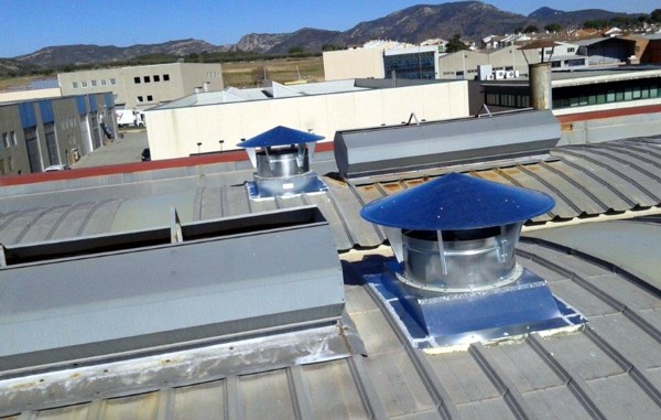 En las imagenes superiores podemos apreciar el montaje los grupos de ventilación, adaptados sobre una cubierta curva o parabólica con una mitra de sujeción a dos aguas sujeta al tejado para garantizar la impermeabilización total de por vida.