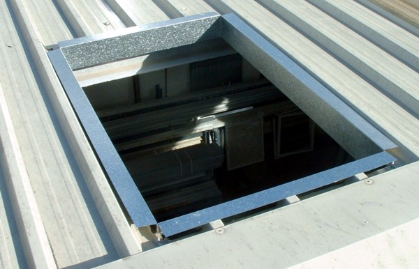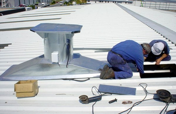 Una vez los equipos depositados en el tejado , los instaladores cortan la cubierta que en este caso es del tipo sandwich, las bases de los grupos de ventilación están fabricados al mismo % de inclinación.