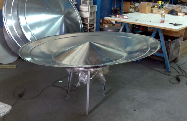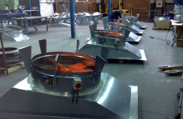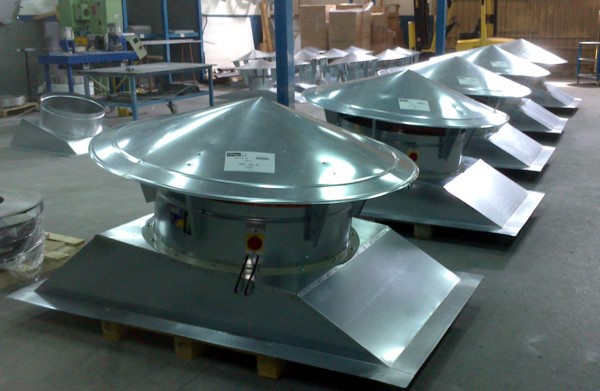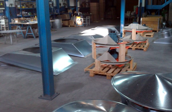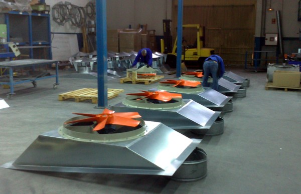 Para su exportación a Marruecos y su instalación en una nave industrial situada en las proximidades de Casablanca, con grandes problemas en las épocas estivales de acumulación del calor bajo cubierta, fabricamos cinco grupos de ventilación dinámica por cubierta de gran caudal. Precisamos para el efectivo funcionamiento del sistema de ventilación un mínimo de veinte renovaciones del aire a la hora, evitando que el calor de la parta alta de la nave pueda llegar al nivel de los trabajadores, proporcionando un movimiento del aire que disminuirá considerablemente la temperatura de sensación.