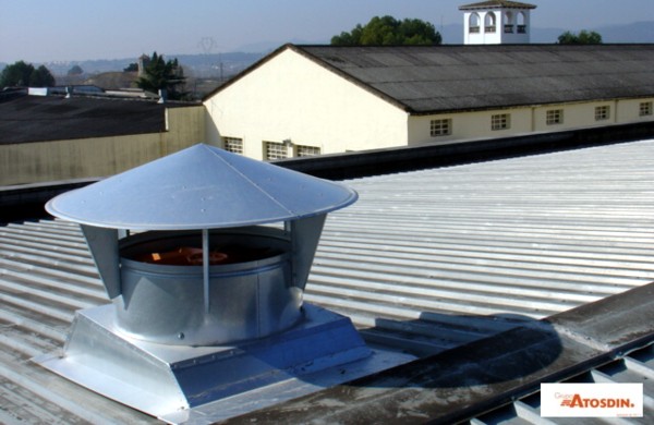 Grupo de aspiración dinámica con motor trifásico y mitra de sujeción a cubierta fabricada a medida instalados en nave de ganadería.